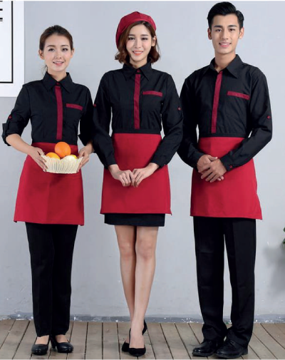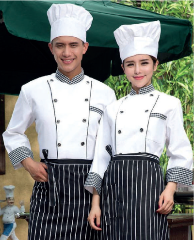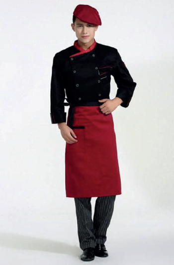 Chaqueta cocina, cuello mao, cierra con doble botonadura. Bolsillo de pecho, manga larga con puño ancho.