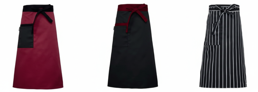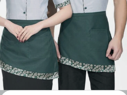 Delantal corto, bolsillo delantero con departamentos, envolvente. La cinta al tono abrocha en la parte delantera.