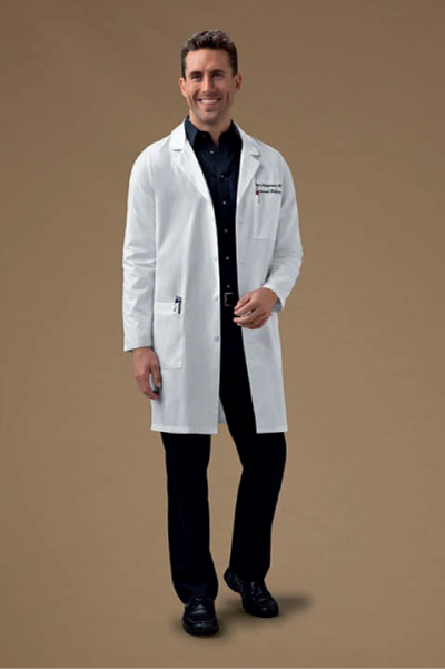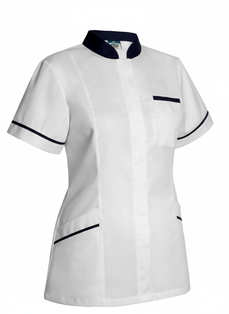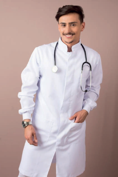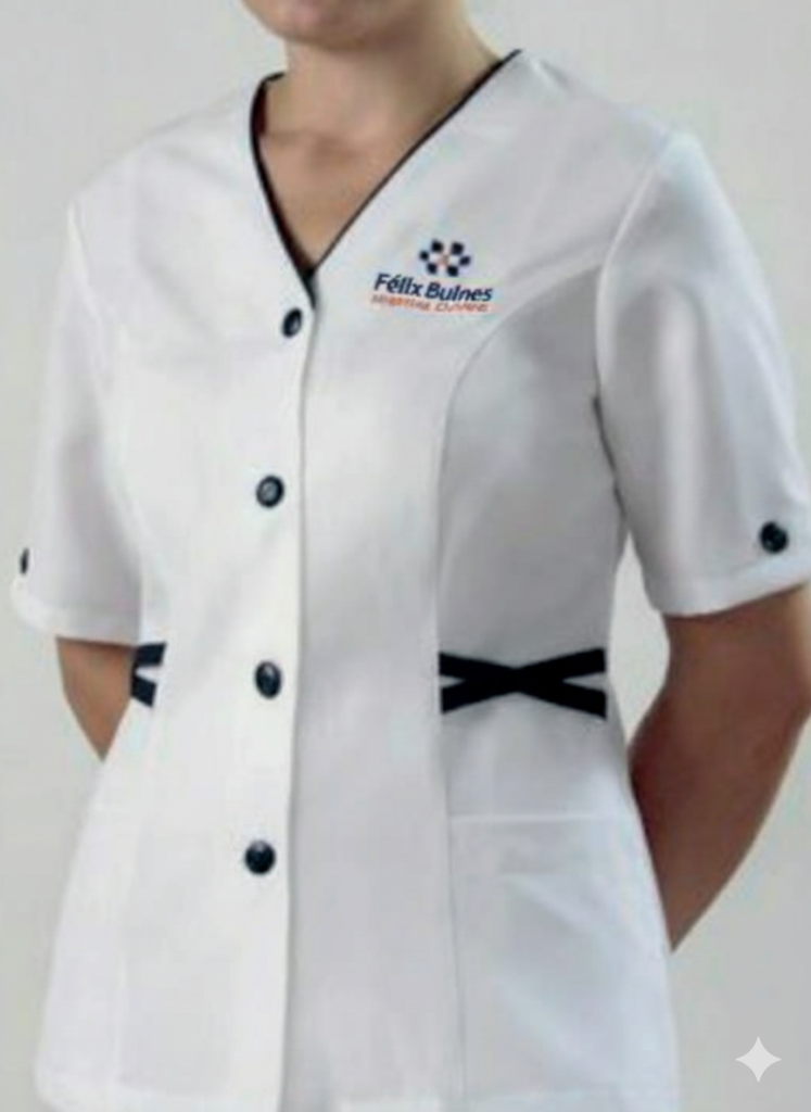 Bata blanca con cierre frontal y dos bolsillos a ambos lados de la misma