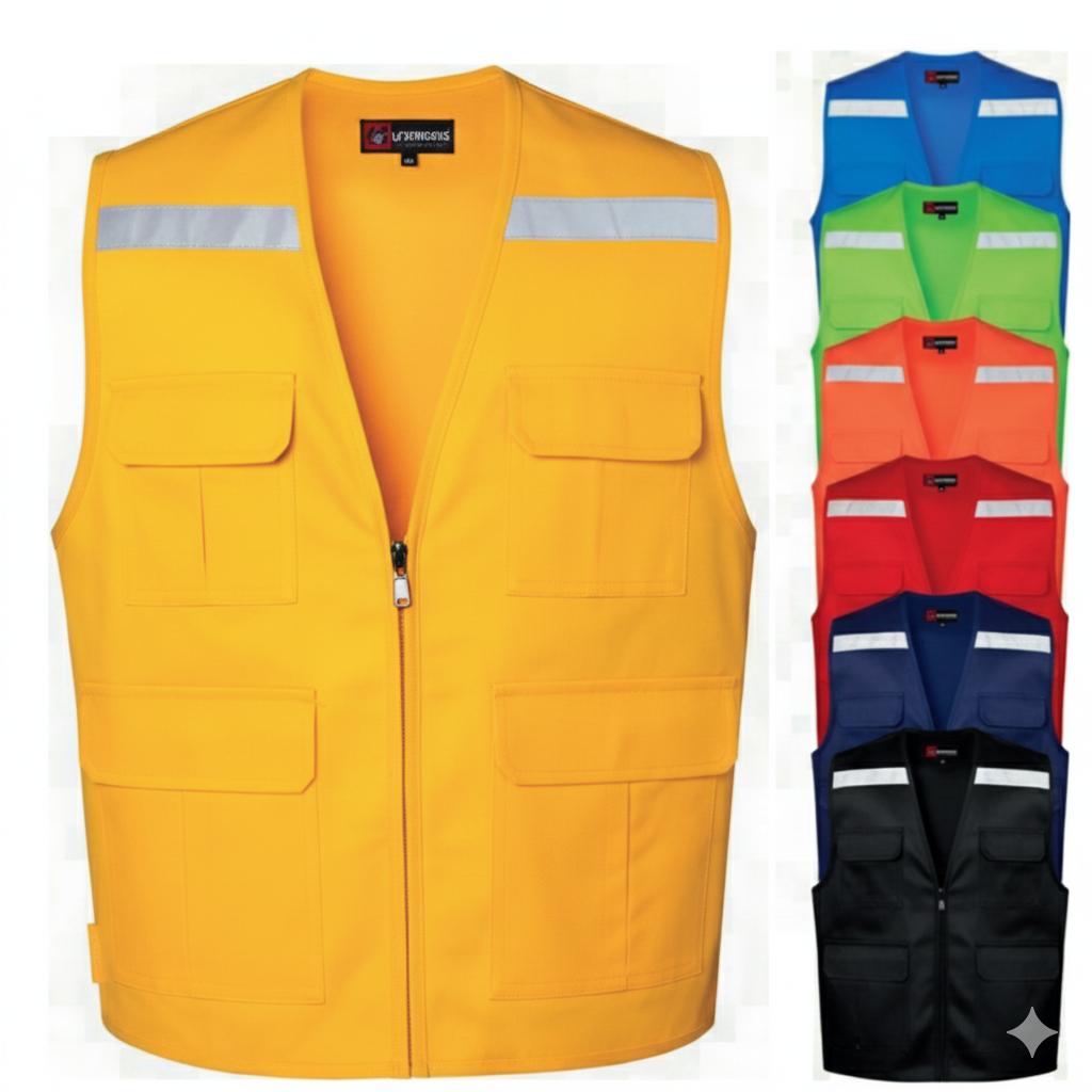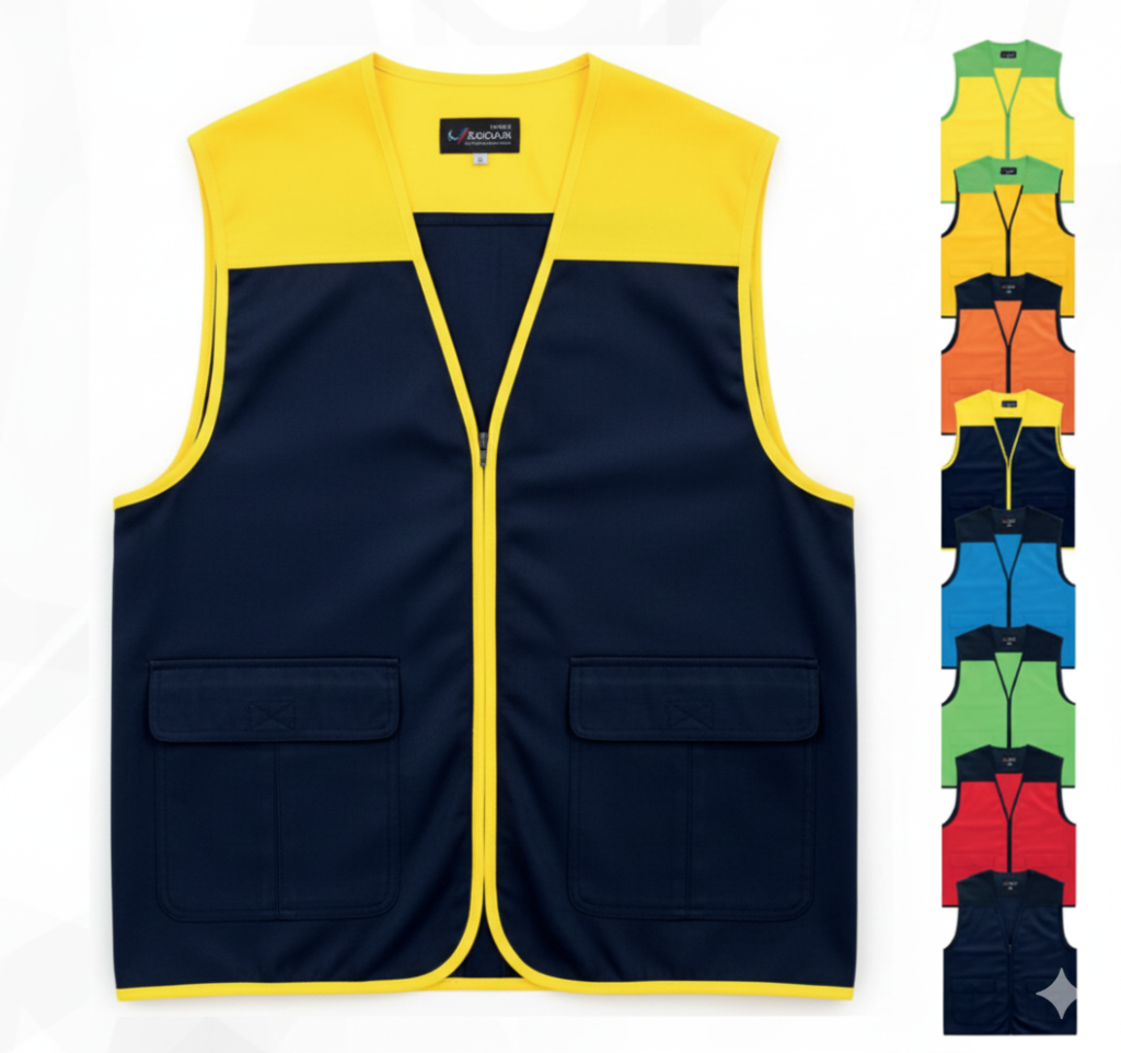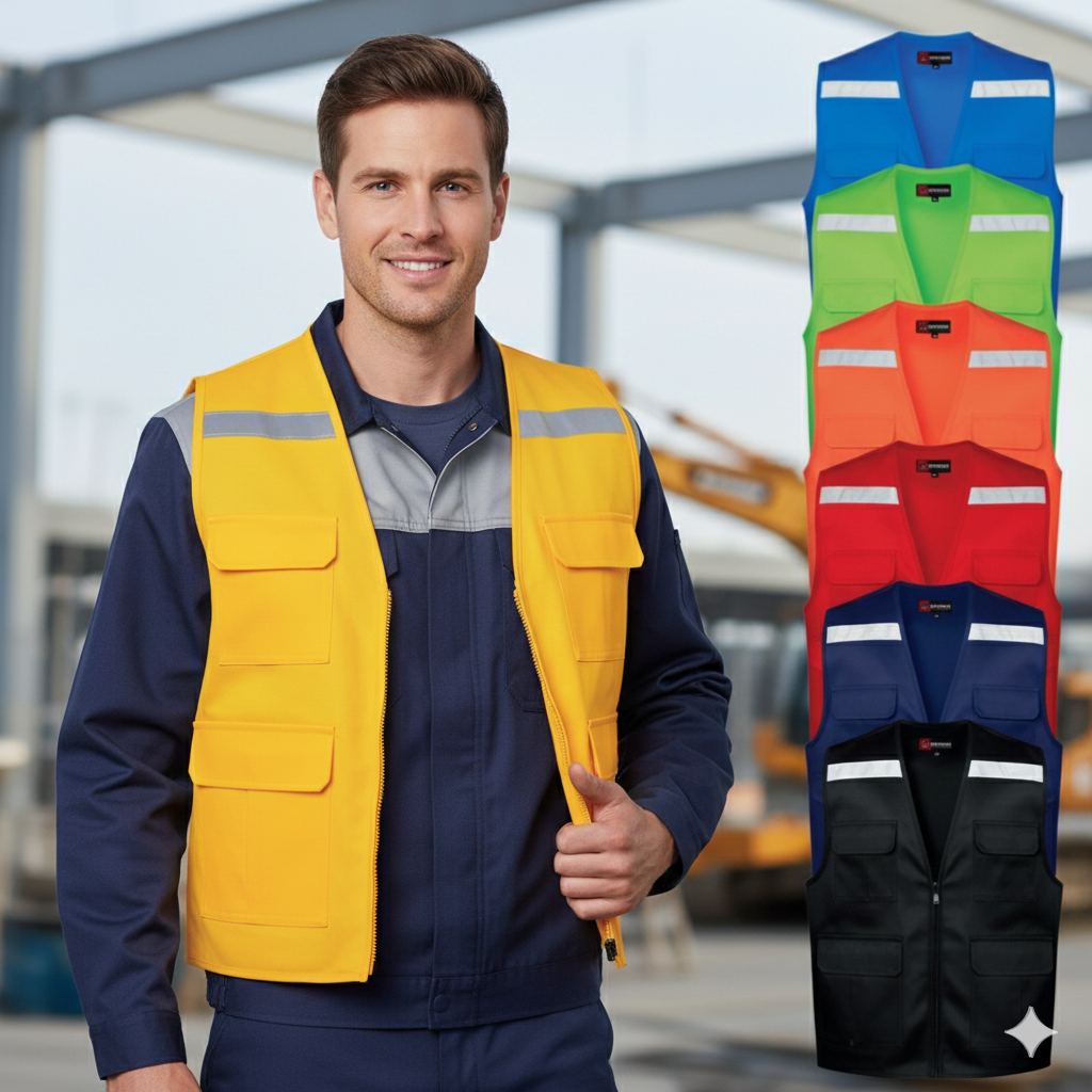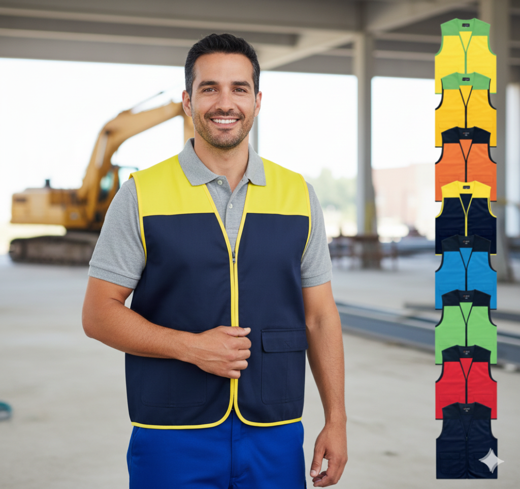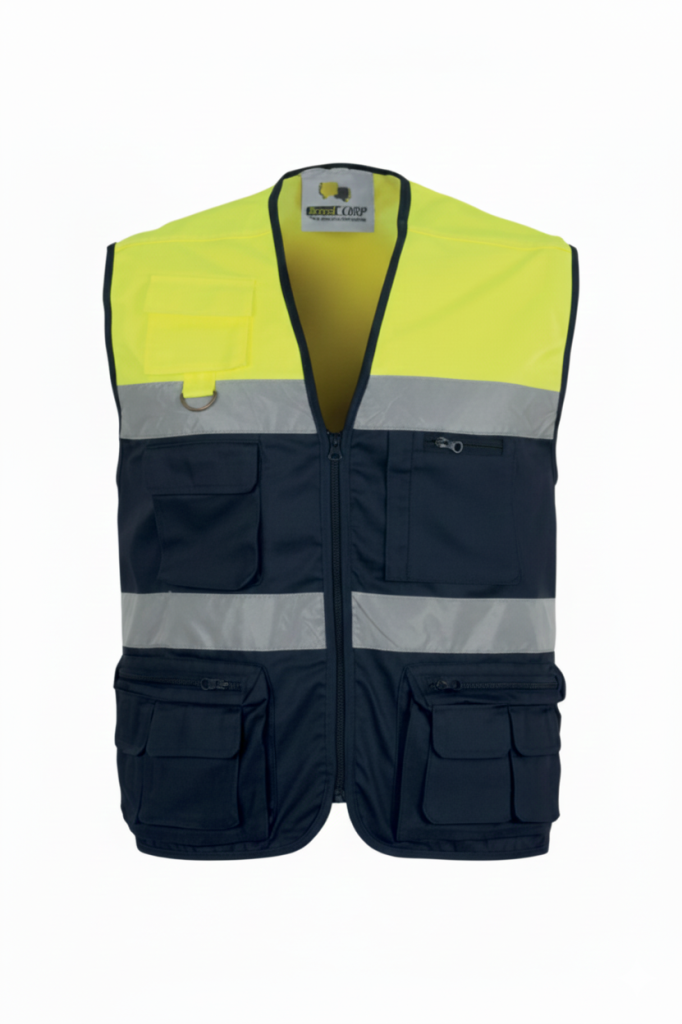 Chaleco alta visibilidad, combinado en dos colores con bandas reflectantes. Cierra en el delantero con cremallera. 2 bolsillos amplios con tapa y velcro en el delantero.
