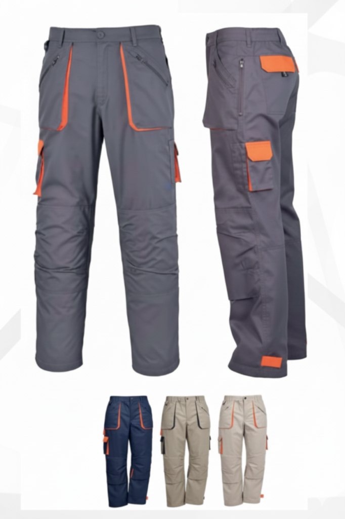 Pantalón alta visibilidad. Cintura elástica con cremallera y botón, 6 bolsillos: 2 bolsillo delanteros, 2 bolsillo traseros y 2 bolsillos en las perneras con doble fuelle y tapa.